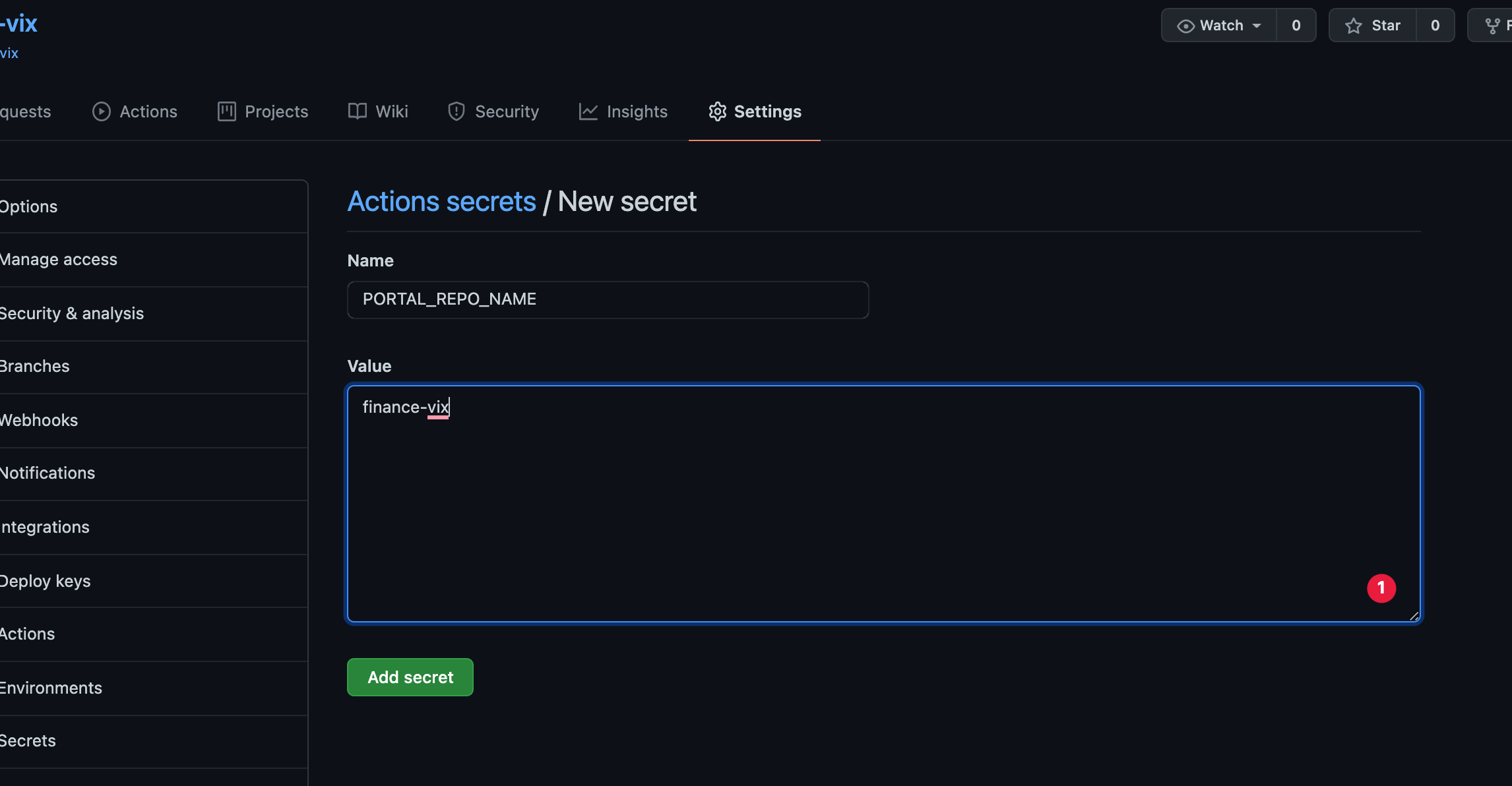 In the dataset repository you want to deploy, create a github secret with the name PORTAL_NEXT_TOKEN. The value should be the PAT created in step 1. See steps on creating a secret here
